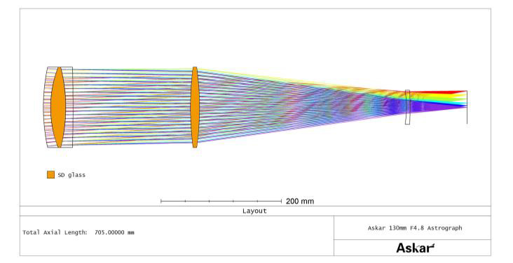 ・「SQA130」は、対物レンズ口径 130mm、焦点距離 624mm(口径比 F4.8)という明るさを備えた、新世代のアストログラフです。・5 群 5 枚のレンズ構成を採用し、そのうち 2 枚のレンズに SD ガラス(特殊低分散ガラス)を贅沢に使用。諸収差を極限まで補正し、視野全体において非常にシャープでコントラストの高い像を結びます。