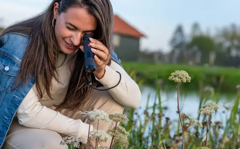 ●対物レンズにねじ込むだけで簡単に装着できる付属のクローズアップレンズは、特に便利です。わずか25~30cmの距離でも、驚くほど鮮明な像を捉えることができます。時刻表を読み解いたり、花の微細な構造を観察したりするのに最適です。