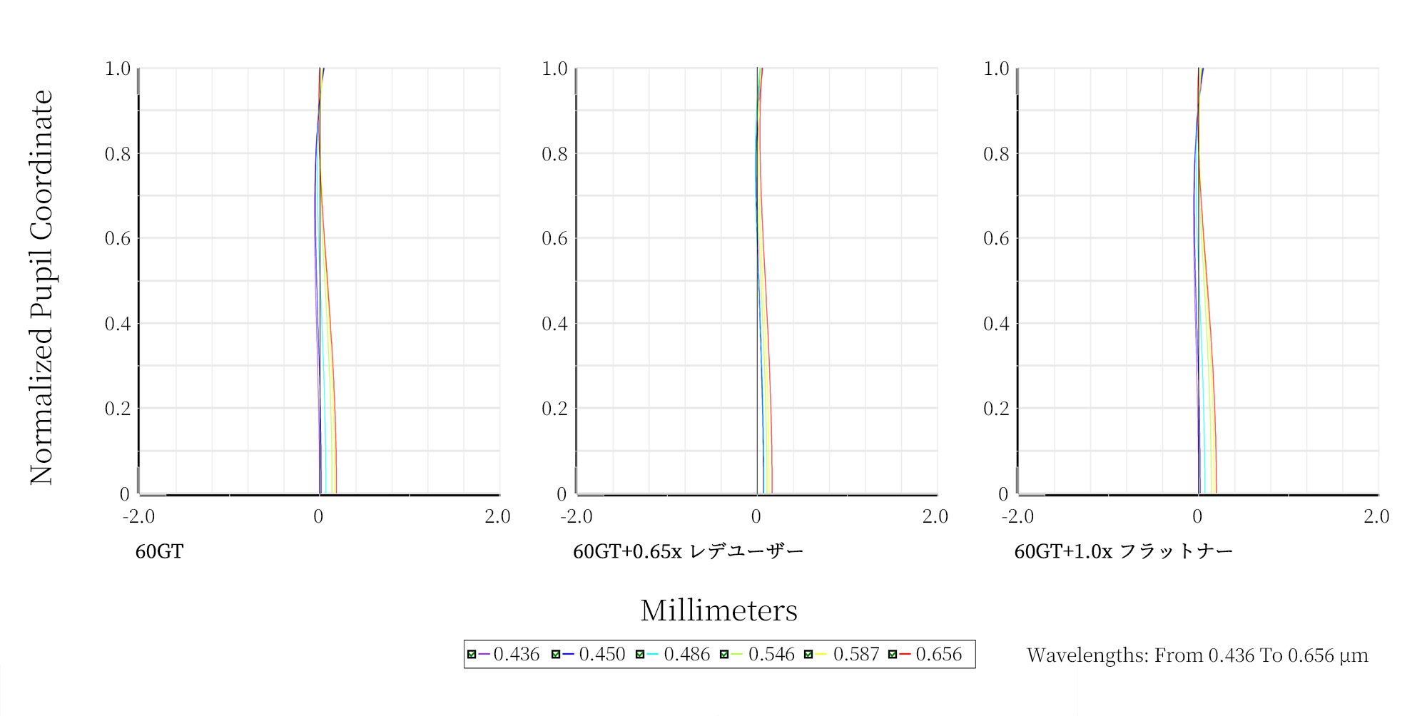 ・レデューサー使用時はF3.9の明るさとなり、大きい対象や淡い対象の撮影に適します。スポット半径は中心で約2.7μm、フルサイズ最周辺で約4.6μmです。