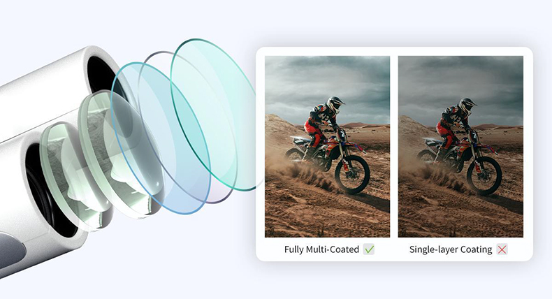 接眼・対物レンズに反射防止多層膜コートを施したマルチコート仕様です。 光の反射やまぶしさを抑え、鮮やかな色彩と高いコントラストを実現。 肉眼で見る以上に鮮明な視界をお楽しみいただけます。