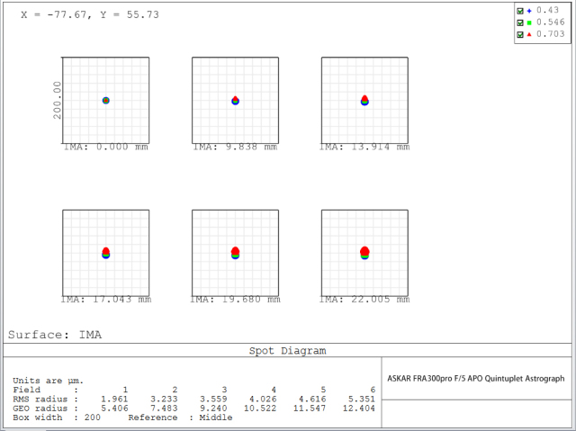 ●最小スポット径は光軸中心でRMS半径約2μmときわめてシャープで、新時代のアストログラフにふさわしいスペックです。最新の高画素センサーで撮影しても十分な解像度が得られます。