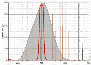 バンドパス幅16nmのラインバンドフィルター。最大透過率96%以上。基本的な透過波長特性や適性は他社製O?フィルターに類似していますが、赤の波長を透過しないため視野内の恒星の色ズレが発生しません。惑星状星雲の輝線であるO?線を含む非常に狭い波長領域のみを透過するため、暗い惑星状星雲や超新星残骸の観測に威力を発揮するほか、特に光害が激しい場所での散光星雲観測にも非常に有効です。