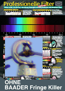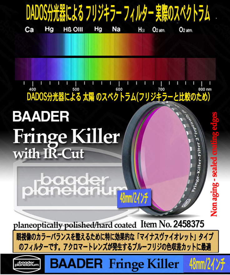 フリンジキラーはデジタルイメージャー(CCDカメラ、各種デジカメ、およびウェブカメラ)にとって、アクロマート屈折望遠鏡の究極の友となります。惑星やディープスカイの撮影では、高度の透過率とフリンジを除去する効果が有効です。バーダー社は有名なUV/IRカットコーティング材を「フリンジキラー」構成要素の一部として設計をしましたので撮影に不要のIR波を完全にカットします。