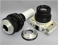 ※徐々に組み合わせをご案内する予定です。 - 他社製の望遠鏡に接続する場合は、Tリングオスネジ+【7528】+【7923】か【7000】+【5014】+PQボディーの組み合わせで接続が出来ます。