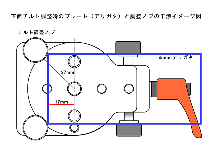 チルト調整ノブが下面になるため、DS38/45PTのプレート(アリガタ)への取付に制限が生じますが、上面調整ができない場合の対応として、チルト調整ネジを下面に付け替えることができます。ただし、DS38/45PTの中心がアリガタプレートの端より長い(17mm以上)と、プレートとチルト調整ノブが干渉するため使用できません。アリガタプレートに2点止めする場合は、中央のUNC3/8雌ネジ部にUNC1/4変換アダプターを装着し、UNC1/4ボルト止めとなります。