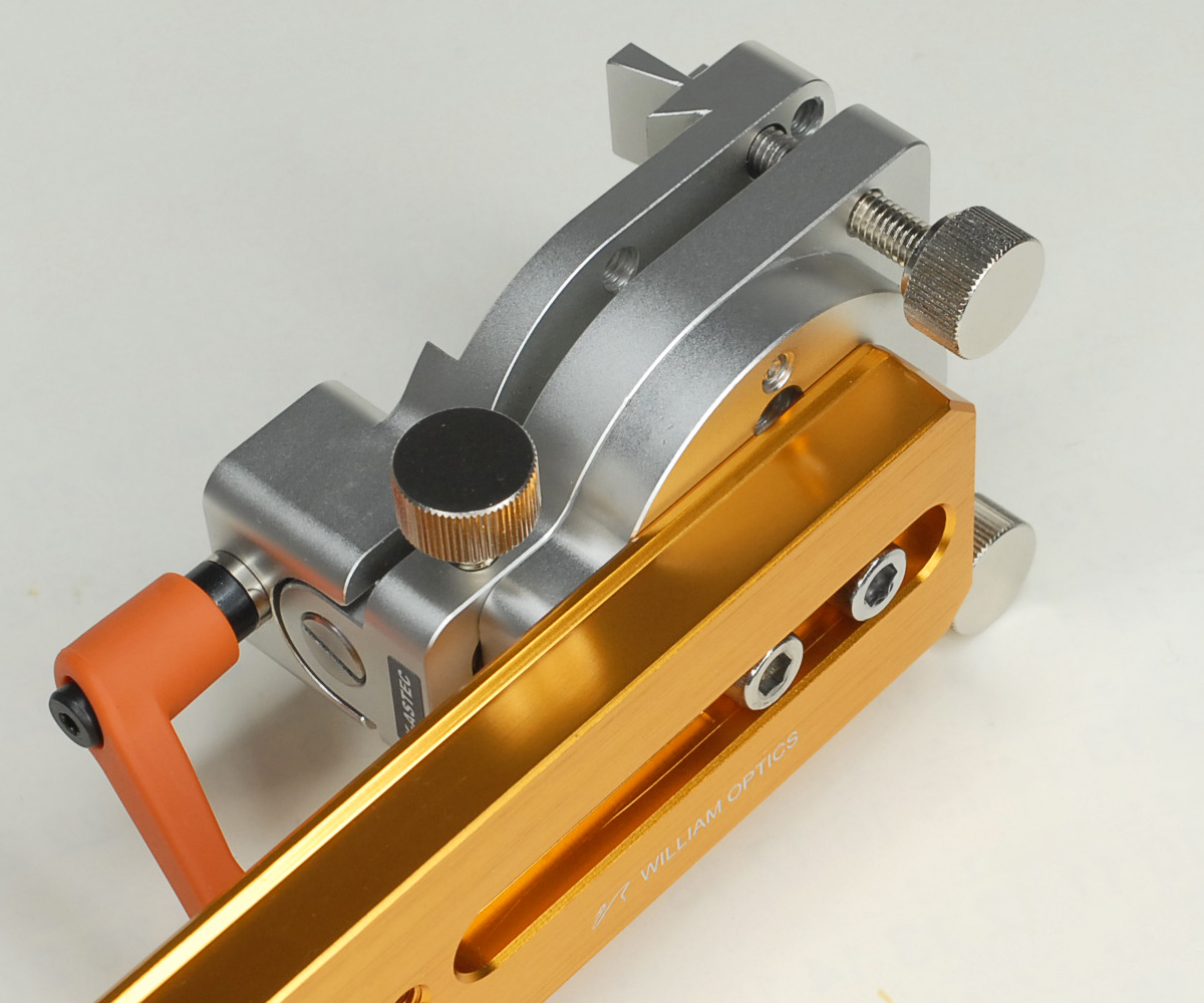 望遠レンズやRED CAT51など、台座が付いた鏡筒の場合、チルト方向の調整は上部から行えます。DS38/45PTの取付制限はありません。ただし、FL55SSなど、スライドバーMを装着した鏡筒は上面調整ができません。