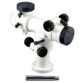 スムーズなハーフクランプ粗動に加え、上下水平軸共にウォームホイルギヤを用いた全周手動微動装置も完備しており、低倍率での星空散歩から高倍率での惑星観測までストレスの無い対象追尾が可能。もちろん左右に2台の望遠鏡が併載可能な上、副鏡筒取付台座が縦方向に設けられているため、L型金具等の補助具なして双眼鏡やスポッティングスコープ等が搭載できます。更にこの副鏡筒保持部は水平・垂直方向共に360゜回転調整でき、主鏡筒と視軸を完全に一致させることが可能。2本の望遠鏡で同じ対象を2人で見る、双眼鏡をファインダー代わりに使う、など、様々な用途にフル対応します。標準付属品のバランスウェイト軸(φ20mmビクセン互換)も水平軸先端と副鏡筒支持部下端の2ヶ所に装着可能なため、搭載する機材の台数や重量に応じて最適なバランス状態が保てます。主・副鏡筒取付台座は共にM8×2/35mm間隔(タカハシ互換)とM6×2/35mm間隔のネジ穴が設けられており、多くのブランドの鏡筒バンドやアリミゾ金具に適合。三脚搭載台座はビクセンGP等のφ60mm規格と互換性があり、様々なブランドの三脚にそのまま搭載可能。肉厚のある堅牢な構造により、丈夫な望遠鏡用三脚に搭載すれば、主・副鏡筒合計15~20kg程度の機材まで軽快に使用できます。