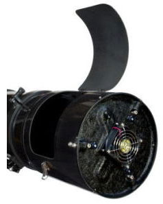 本機の最大の特徴は鏡筒の形状にあります。大胆な変形鏡筒を製作するため、素材にはGFRPを採用しています。筒先を十分長くとり、更に先端を内側に折り込むことにより遮光フードの役割を与えています。接眼部対面の鏡筒内(接眼部-斜鏡を結ぶ直線の延長線上)を内側から大きく凹ませるユニークな構造を採用し、接眼部に混入する反射迷光を大きく減じているのも大きなポイントです。更に主鏡付近の鏡筒径を前方よりも約1割ほど大きくし、更に双方の接合部に筒内バッフルを設けることにより、主鏡面で反射した迷光を効果的に遮断しています。これらの徹底した特別仕様により、本機は昼間の景色を高倍率で見ても色調が全く色褪せないほどの高い像面コントラストを示し、明るい惑星を見ても視野の縁が見えないほどのバックグラウンドの暗さを達成しています。また、前後の鏡筒接続部には楕円形の換気口を複数設けており、更に主鏡セル背面には電動換気ファンを標準装備。主鏡から立ち昇る熱気に起因する筒内気流の排出対策も非常に優れています。鏡筒後部側面には主鏡面のメンテナンスに便利な横窓も設けられており、いつでも主鏡面を綺麗な状態に保つことが可能です。
