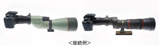- ススポッティングスコープTSN-880/770シリーズ、PROMINAR 500mm F5.6 FLとデジタル一眼カメラとを接続し、望遠撮影をするためのアダプターです。スコープ本体にアイピース(TE-11WZ)を取り付けたままデジタル一眼カメラのボディを接続することができます。