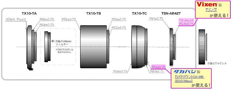 ・ 各社用カメラマウントに対応従来のテレフォトレンズ/スコープ「PROMINAR 500mm F5.6 FL」用マウントアダプタ-TX07/TX10は、各社カメラメーカー用のマウントと一体型となっていましたがTX07-T/TX10-Tは、オプションのカメラマウント(Tアダプタ-)TSN-CM2 / TSN-CM3、または他社製Tマウント(Tリング)各社用などを併用することにより、カメラマウントを交換するだけで各社のカメラに取りつけることができます。