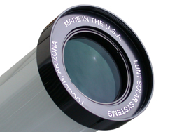★専用設計の対物レンズ ねじ込み式の金属キャップを外すと、有効径φ50mm、1群2枚構成の対物レンズが現れます。軸上のコマ収差、非点収差、軸の偏芯を排除、後群のコリメート光学系とのマッチングで焦点距離350mmの平坦な像面に、ブロッキングフィルターを通過したHα単色の太陽光が約φ3mmに結像します。 |