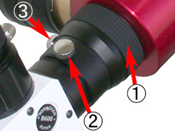 ★ヘリコイドによる合焦メカニズム ヘリコイドリング(1)を廻すことで、約6mm+αの繰り出し量が得られる直進ヘリコイド式合焦装置です。さらに繰り出しが必要なときは(2)の固定ネジをゆるめてブロッキングフィルターをわずかに引き出すことで対応できます。なお、(3)のヘリコイド固定ネジを締めてピントを固定することもできます。 |