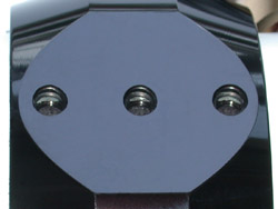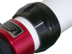 ★鏡筒バンド アルミ合金削り出しによる、上下分割式のバンド。2本のボルトで連結されます。上部バンド中央には、テレビュー社製太陽ファインダー「ソルサーチャー(※別売)」取り付けのためのミゾ加工があります。 |