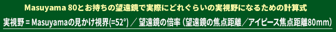 マスヤマ80使用で焦点距離800mmの鏡筒で得られる倍率はなんと10倍! 口径356mm/F11のC-14鏡筒なら49倍で、実視野はなんと1.1°!さらに公共天文台で等で使用される500?/F15大型カセグレン鏡筒においても、94倍という低倍率に満月、スバル、その他の星雲星団の全体が大迫力で見える実視野0.55°が実現できます。覗きやすく、閉塞感のない52°の実視野により、広いスペース・ウォークの気持ちで観望して頂けます。 |