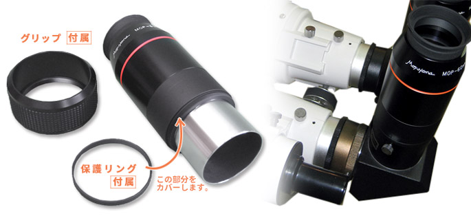 アイピース本体の「ゴムのグリップ部分のみ」を慎重に緩め取り外し(スリーブ部分をしっかりと握りながら行なうと作業がしやすいです)、付属の「保護リング(双眼:2本並列用)」でそのネジ箇所を固定します。