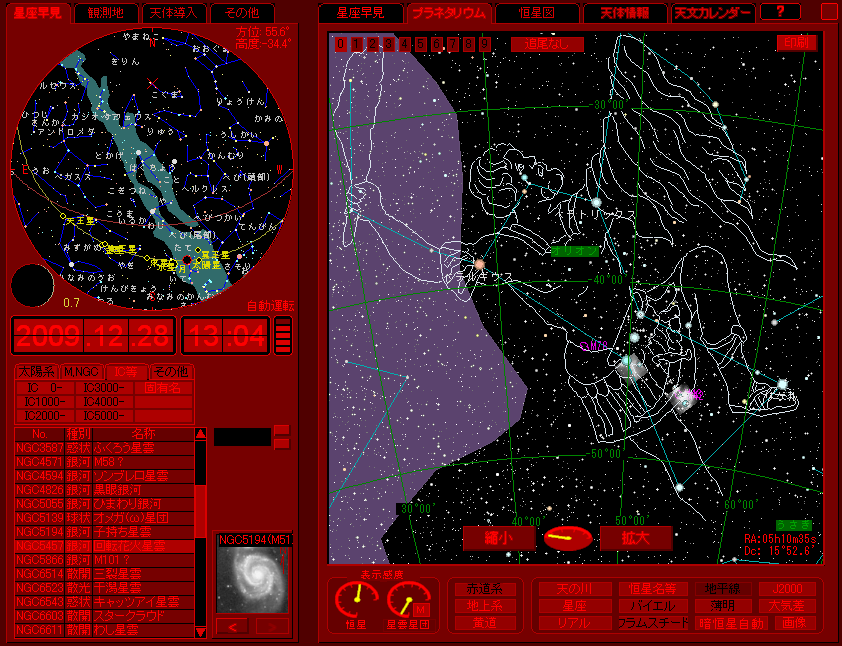 | 恒星図 | 赤道座標系、地上座標系、視位置、2000年分点、1950年分点、オートスケーリング、仮想天体登録編集 | |