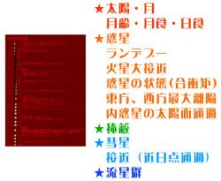 | 天文カレンダー | 月齢、日食、月食、その他惑星現象、彗星、ランデブー、掩蔽、彗星接近、流星群、など | |
