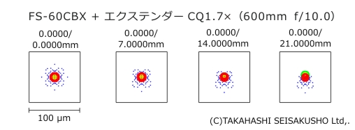 エクステンダーCQ1.7×を組み込むと中心収差はストレール比率で対物レンズだけの時より10%以上向上します。周辺像は35mmフルサイズの端まで中心像とほとんど変わらないほどのフラットフィールドとなり、周辺光量は最周辺でも95%あります。