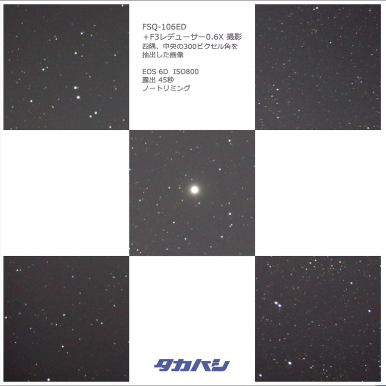 このレデューサーは、FSQ-106EDとFSQ-130EDの両方にマッチングするように設計していて、併用することによりFSQの主焦点f/5をf/3にまで明るくします。イメージサークルはφ44mmと35mmフルサイズに対応しています。f/3まで明るくしても、倍率色収差と色コマの発生を高屈折低分散ガラスを使用することで極力抑えています。
