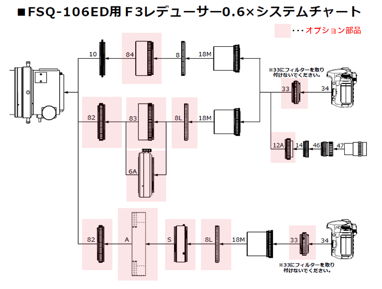 ●6A. カメラ回転装置(CCA-250)[KP86200] ●8L. 2種アダプター(FSQ-130ED)[KP38003] ●12A. 眼視アダプタ-(CCA-250)[KP86005] ●18M. F3レデューサー0.6x[KA38581] ●33. カメラマウントDX-WR(EOS)[KA01251]/(Nikon)[KA01255] ●34. 一眼レフカメラ(Canon-Eos,Nikon) ●47. 31.7アイピース ●82. 645RDアダプター[KA36581] ●83. 645RD補助リング[KA36582] ●84. F3RD補助リング[KA38582] ●A. β-SGR180FL[KA00800] ●S. 98_98L25.5リング[KA00825] |