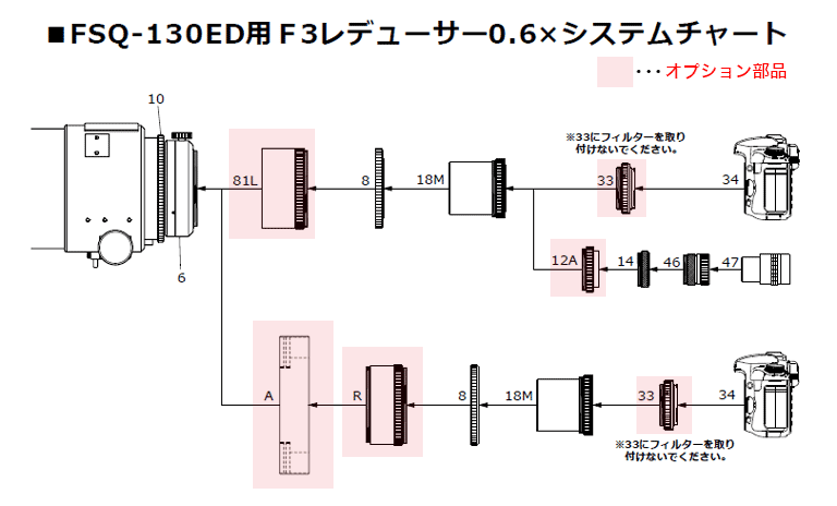 ●6A. カメラ回転装置(CCA-250)[KP86200] ●12A. 眼視アダプタ-(CCA-250)[KP86005] ●18M. F3レデューサー0.6x[KA38581] ●33. カメラマウントDX-WR(EOS)[KA01251]/(Nikon)[KA01255] ●34. 一眼レフカメラ(Canon-Eos,Nikon) ●47. 31.7アイピース ●81L. 補助リング[KA38206] ●A. β-SGR180FL[KA00800] ●S. 98_98L25.5リング[KA00825] |