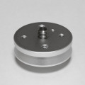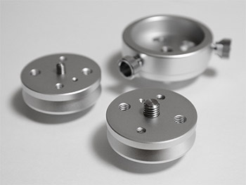 本体部分は従来のテーパーアダプターを流用し、真ん中の1/4インチカメラネジを3/8インチカメラ太ネジに変更しました。ネジの突出量は約7mmです。35mm間隔のM6とM8のネジ穴を十字に配しています。そのうちM6のネジ穴には、回り止めとして、先端が平らなステンレス製のイモネジを組み込んでいますので、一点止めでも機材を頑強に取り付けることができます。