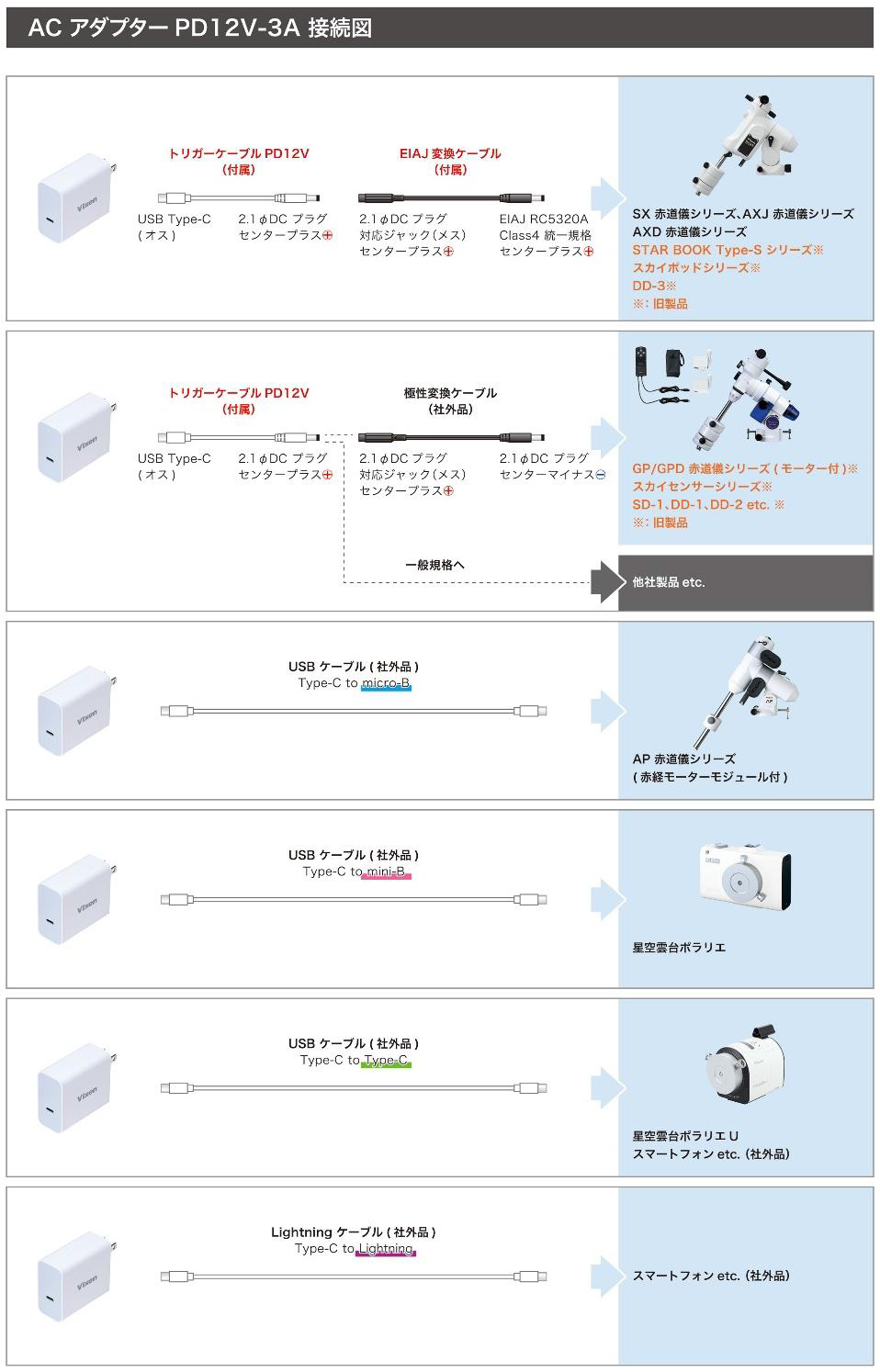ACアダプターPD12V-3Aはビクセン製品用でご用意しておりますが、市販のUSBケーブル、USB PDケーブルおよびUSB PDトリガーケーブル等の併用により一般機器の電源や充電器として電力を供給できます。※接続先となる機器の仕様によっては動作できないこともございます。