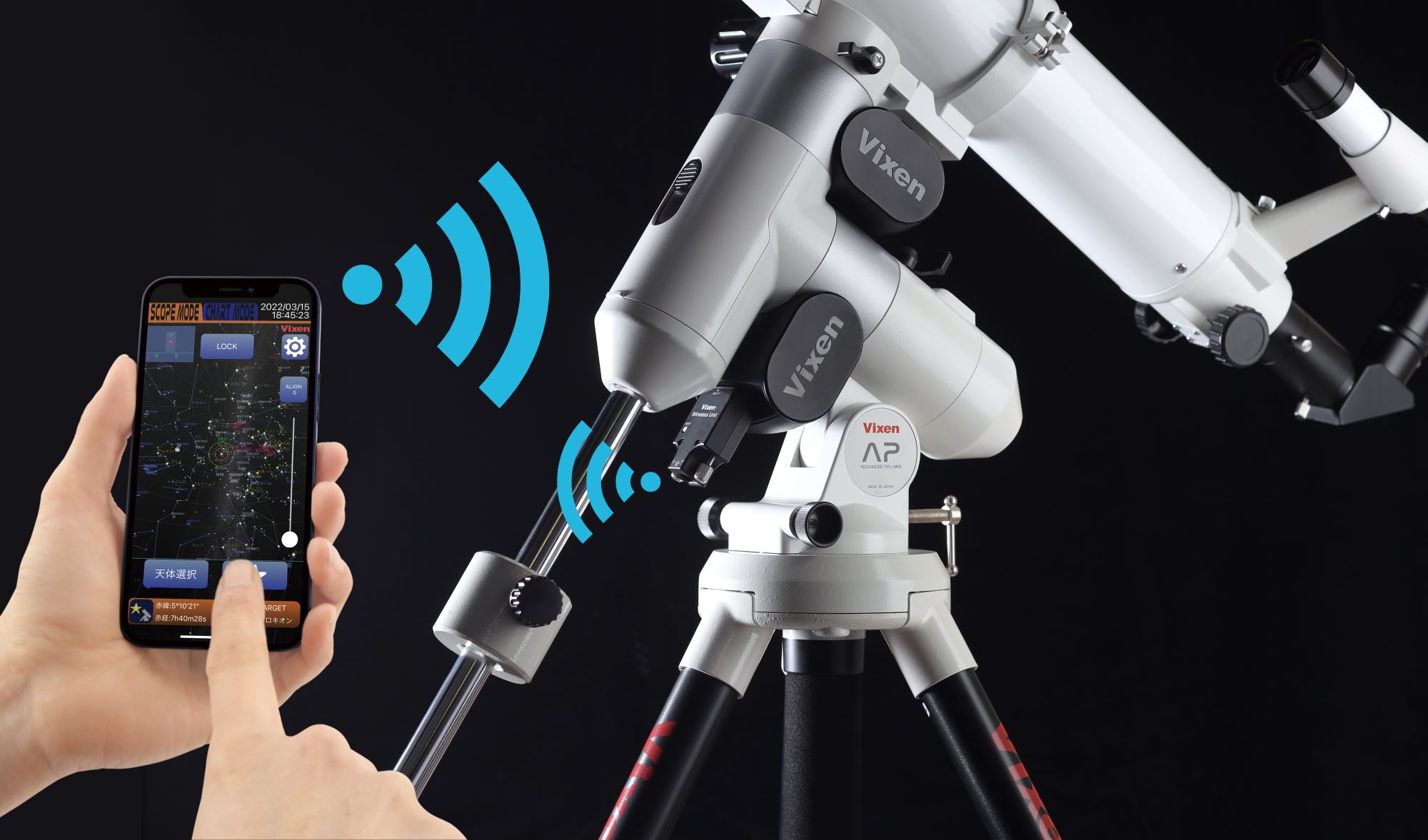 天体望遠鏡を無線制御できるワイヤレスユニットを搭載。お手持ちのスマートフォンから、自動導入・自動追尾など多彩な機能を手軽に使用可能(専用アプリ使用)。