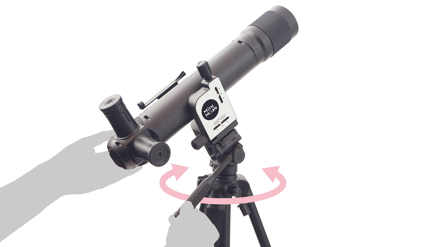 ミルムーンは鏡筒部に、高度(上下)と方位(左右)を精密に調整できる「微動ハンドル」を内蔵。 小さなお子さまでも扱いやすいスムーズな操作性で、初めてでも簡単に月を視野に導入することができます。 また、視野に入れた後も刻一刻と動く月を追いかける時にも役立ちます。
