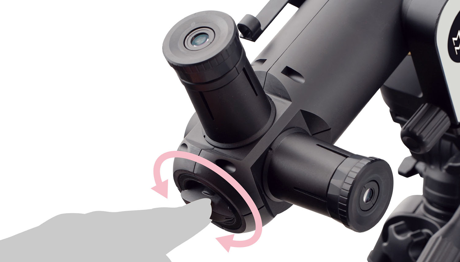 対物レンズ側のローレット(リング)を回すと、ピント調整が可能です。 接眼部からローレットまでの距離は、お子様でも望遠鏡をのぞきながら簡単に手が届くサイズ感に設計しました。
