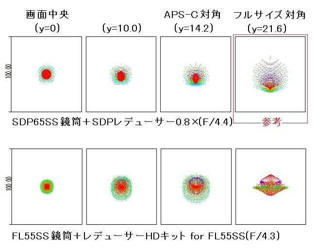 写真性能でご好評をいただいております「FL55SS鏡筒+レデューサーHD for FL55SSキット」でも、スポットダイアグラムで100μmスケールまで拡大すると周辺像が多少歪になっています。SDP65SS鏡筒ではバランスよく補正され、丸く整った星像であることが分かります。