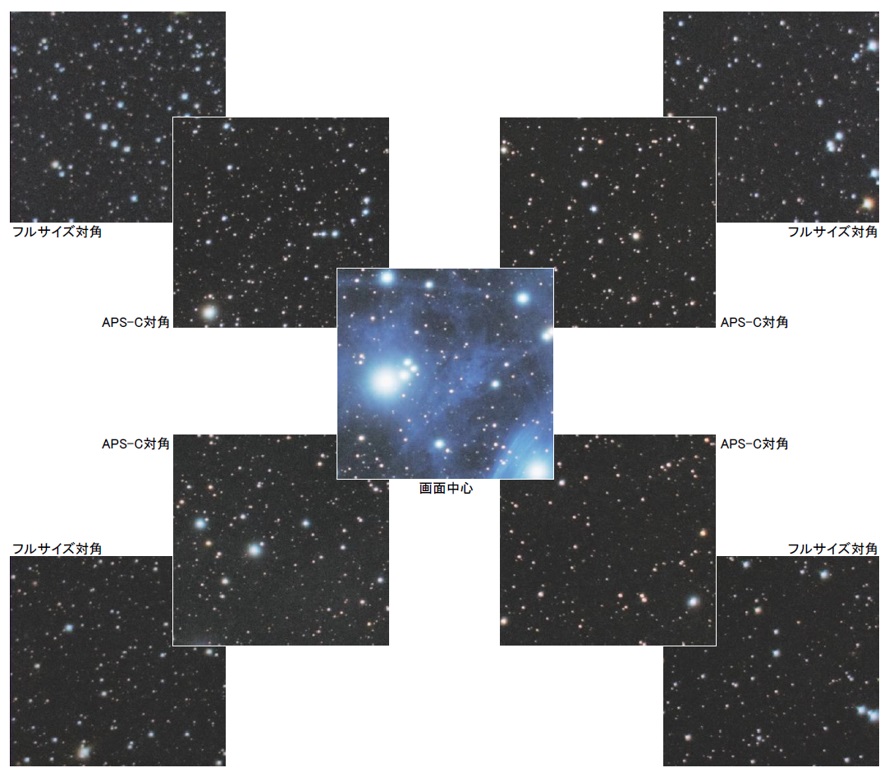 イメージサークルφ30mm(APS-Cをカバー。最周辺光量90%以上)。フルサイズ最周辺φ44mmでも星像の崩れを最低限に抑えつつ、光量70%を確保しています。