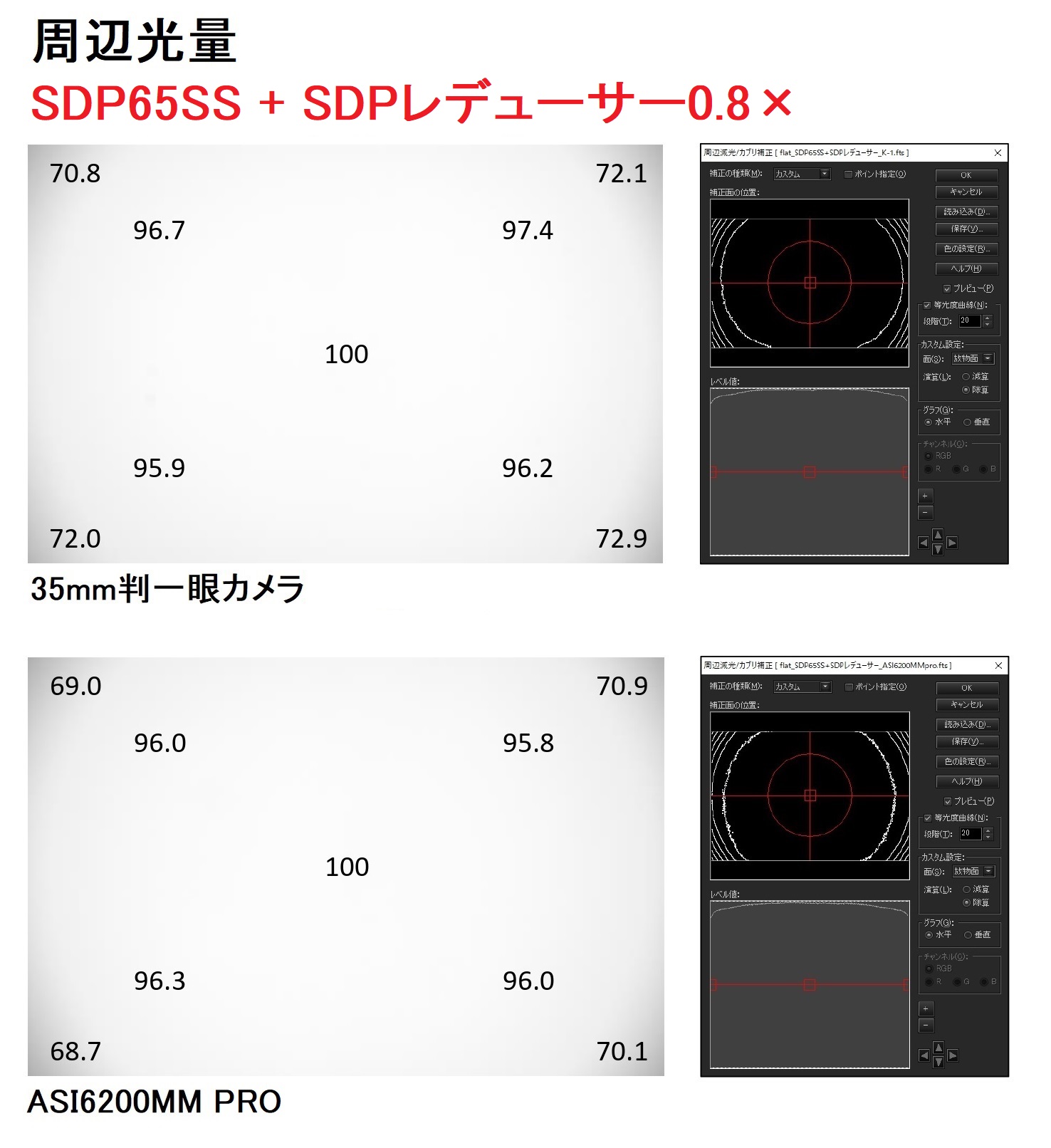 SDP65SS鏡筒の焦点距離を約0.8倍に短縮するとともに、F値を5.5から4.4に変更します。イメージサークルφ30mm(APS-Cをカバー。最周辺光量90%以上)。フルサイズ最周辺φ44mmでも星像の崩れを最低限に抑えつつ、光量70%を確保しています。