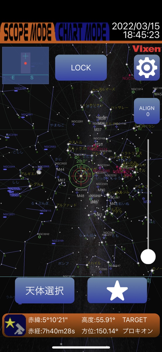 指標に描かれた星座を表示するので、見える位置を容易に知ることができます。