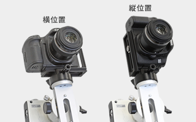 | ■横位置プレート クイックリリースアングルプレートの横位置プレート1枚を単独で使用することもできます。カメラネジ1/4インチを装備した天体望遠鏡鏡筒なども取付けできます。 ■縦位置プレート レリーズなどの配線による干渉を避ける穴を設けています。 |