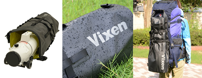 ナイロン素材には緩衝材が組み込まれており、機材を衝撃から守ります。また、素材のつなぎ目には縫い目のないウェルダー(溶着)加工が施されており、水の入りにくいロールトップ式の開口部とあいまって、湿気や水濡れに強いケースとなっています。 外側にはバックパックに固定できるベルトも装備され、ベルトの位置も調整可能です。ケースの上部・下部の4箇所に設置されたDリングに別売のストラップを装着すれば、肩にかけたり、背中に背負ったりしても使用できます。これまで鏡筒や三脚の持ち運びは車が主流でしたが、「スコープキャリア」を使用することで電車移動の際にも便利になりました。また、携帯性に優れることから、トレッキングなどの山歩きの際にも活用できるので、空気の澄み切った山や高原での天体観察も楽しめます。ケース下部のVixenロゴには反射素材を採用し、暗い場所での事故を未然に防ぎます。