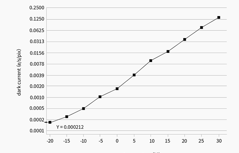 ●ZWO社独自の暗電流抑制技術により、冷却温度0℃では暗電流ノイズはわずか0.0017e/s/pix。300秒の露光で発生する暗電流ノイズはわずか0.51e/pixとなり、無視できるレベルとなります。