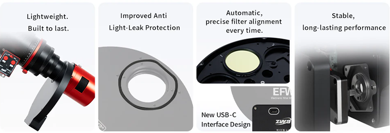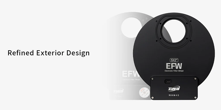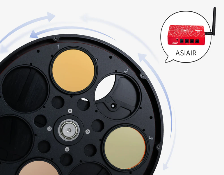 ●NEW EFWは、精密な位置インデックス機能を備えた電動双方向フィルターホイールドライブを搭載し、ASIAIR(別売)等と組み合わせて使用することで、予めスケジューリングされた撮影セッション中にフィルターを自動交換、でハンズフリーの天体写真撮影が可能になります。