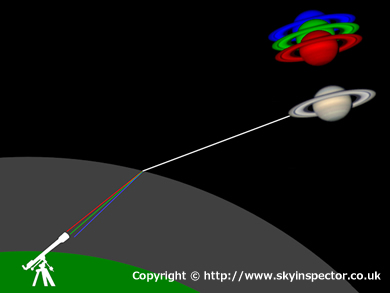 | ■「大気による色収差(分散)」とは? 惑星観測の際に、夜空の低い高度では地球上の大気中を光が斜めに通過する為、プリズム効果によって惑星の上下に色にじみが発生します。 45度以上の観測高度ではあまり問題にならないのですが、夏季の惑星の観測条件の良い時期ほど南中高度は低くなり、高度30度程度以下での観測や撮影を余儀なくされる場合が多くあります。そのような時には大気差による色にじみによって解像度が低下してしまいます。 その色収差を打ち消す補正プリズムを通すことで、大気分散を補正します。 |