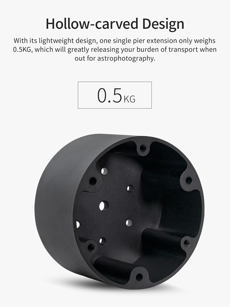 ●軽量ながら高強度で耐久性も高い、AM5赤道儀に重量物を搭載する場合用の積み上げ式のハーフピラーです。●AM5赤道儀(5.1kg)+積載機材(最大20kg+ウェイトシャフト0.5kg+バランスウェイト5kg)の重量合計約30kg程度までの搭載が可能。(メーカーアナウンスの「最大50kg」はあくまで”強度上”の理論値です。)