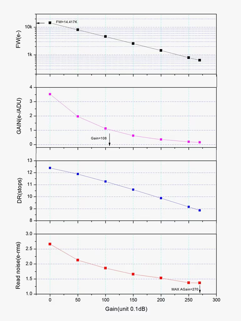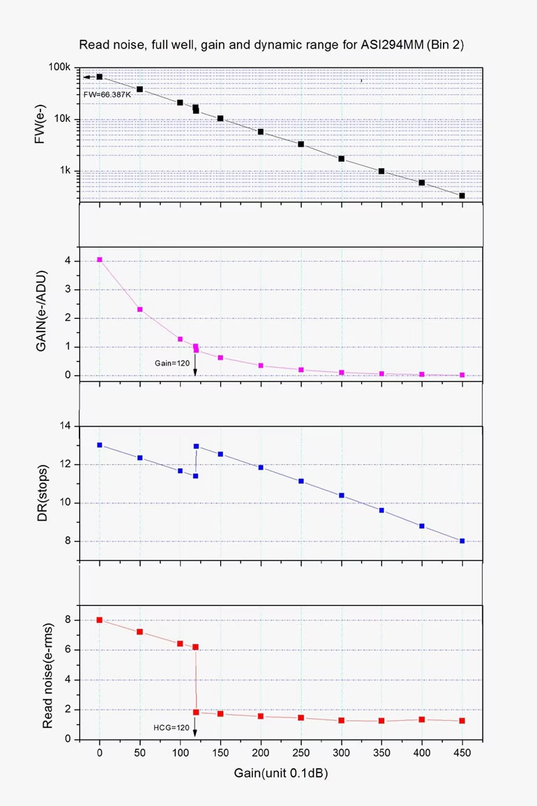 ●ASI294MMには「HCGモード」が組み込まれており、高いゲイン値での読み出しノイズを効果的に低減し、低いゲイン値と同じように広いダイナミックレンジを維持可能です。ゲインが120 (12db) を超えるとHCGモードがオンになり、読み取りノイズは2e未満に低下しますが、ダイナミックレンジはそのままとなります。