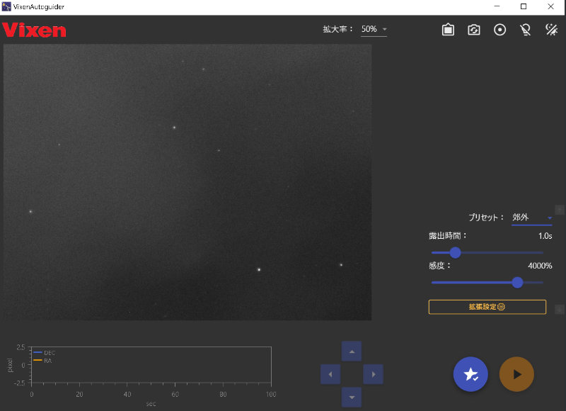 VAソフトのインターフェースは、直感的で使いやすいレイアウトになっています。画面の左側には、VA225C カメラが捉えている星空の映像がリアルタイムで表示されます。画面右側には各種設定パラメーター、左下にはガイドグラフが表示され、現在のガイド状況を視覚的に確認することができます。