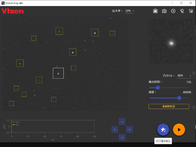 次に、右下の「ガイド星選択」ボタンをクリックします。カメラが自動的に使用可能なガイド星を検出し、四角い枠で囲って表示します。その中から1つの星をクリックで選択すると、選んだ星が右上に拡大表示され、キャリブレーション(方位と動作方向の調整)が開始されます。