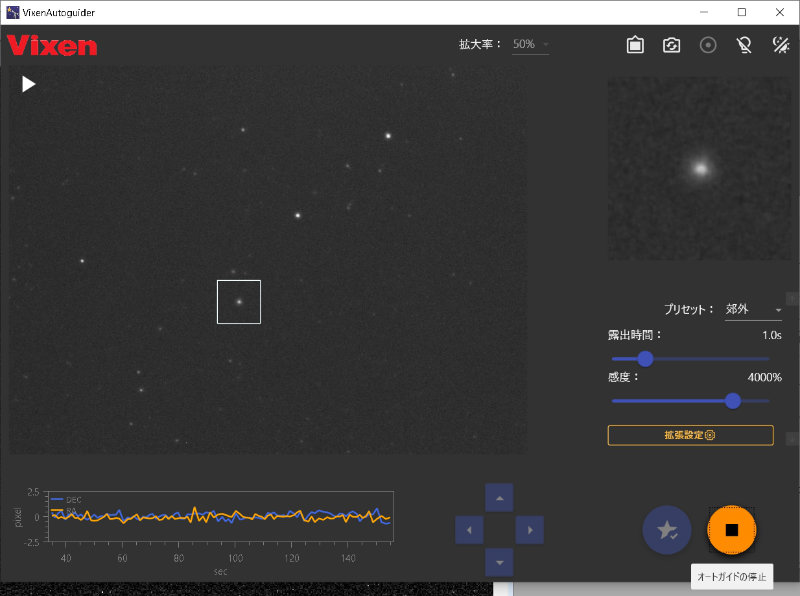 キャリブレーションには数十秒程度かかり、完了すると自動的にオートガイドが開始されます。同時に左下のガイドグラフがリアルタイムで動作し、ガイドの補正状況や精度を確認することができます。