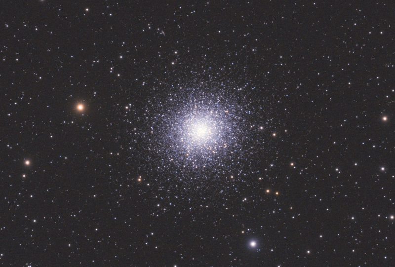 下は、露光時間300秒で撮影したヘルクレス座の球状星団M13の画像(中央部をトリミングしています)です。合計8コマ撮影しましたが、すべて星は点像を保っていました。SD103Sの焦点距離は約810㎜ですので、焦点距離約160㎜のビクセンファインダーを使っていることを考えれば、ガイド精度として十分と言えるでしょう。