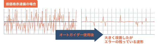 高精度に製造された赤道儀のウオームがわずかに残した誤差に起因するPEは、“良いPE”です。良いPEはなだらかで規則正しいサインカーブのようなガイドグラフを描きます。エラーの変化量(グラフが進む角度)が緩やかであれば、エラー量(グラフの上下の高さ)が多少大きくても、オートガイダーでほぼ完全にエラーを取り除くことができます。つまり「良いPEを持つ赤道儀」は、オートガイダーの助けを借りればほぼ完全なガイドを実現することができますので、結果として「良い赤道儀」であるといえます。